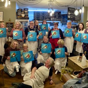 The evening will cover a guided tutorial, materials and use of aprons during the session, (Recommend wearing clothes you don’t mind getting messy – acrylic paint is permanent once dried). The best bit is you get to take your painting home with you at the end.
